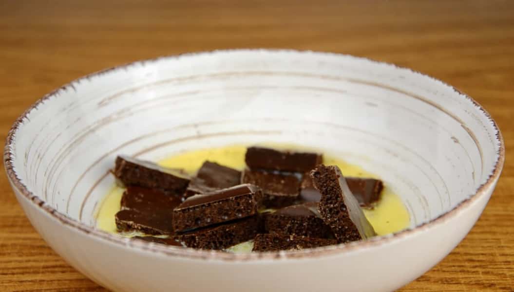 А тепер приготуємо шоколадну глазур. Для цього 25 г вершкового масла та 25 мл молока нагріваємо до гарячого стану, але не кип’ятимо. А потім висипаємо до них 50 г темного шоколаду. Даємо йому почати танути, а потім добре перемішуємо. Спочатку може здатися, що маса розшаровується, але ви продовжуйте перемішувати, в результаті вийде гладка блискуча глазур. Якщо вона вийде густа, тоді нагрійте її трохи на паровій бані або в мікрохвильовій печі.