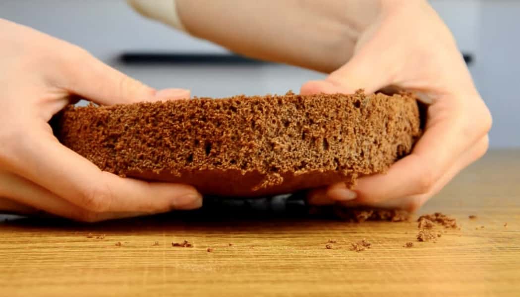 Тепер корж ділимо на 2 коржі. У мене він вийшов висотою в 3 см, тому корж, який піде для основи торта, я роблю висотою в 2 см, а який піде в крихту 1 см.