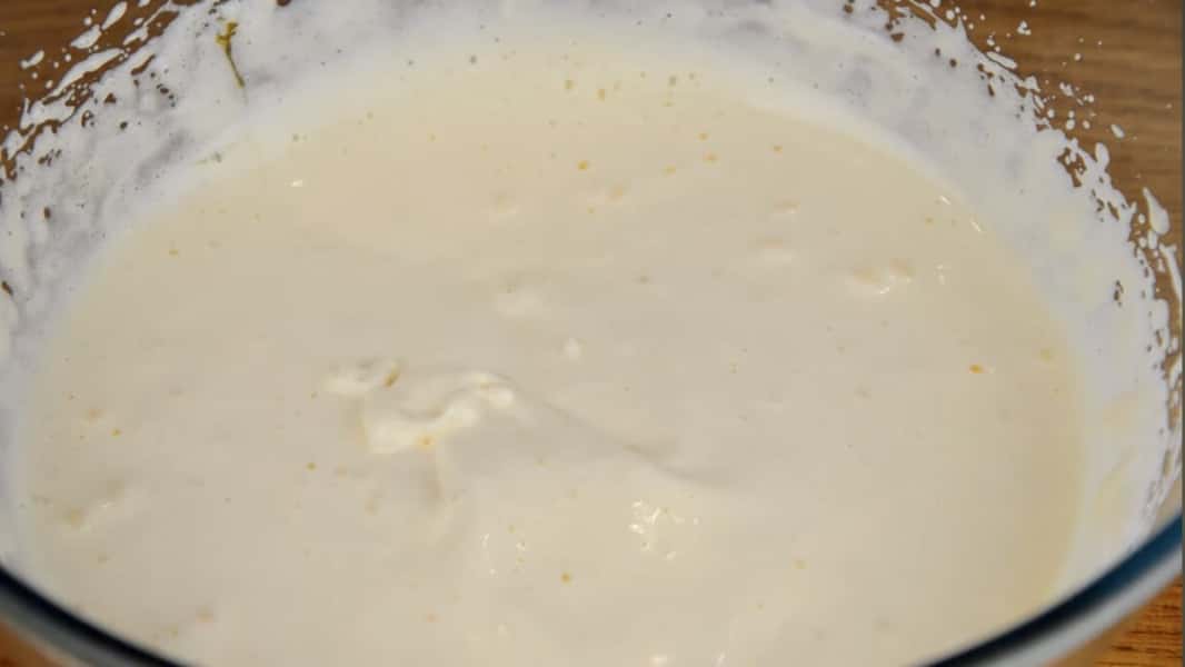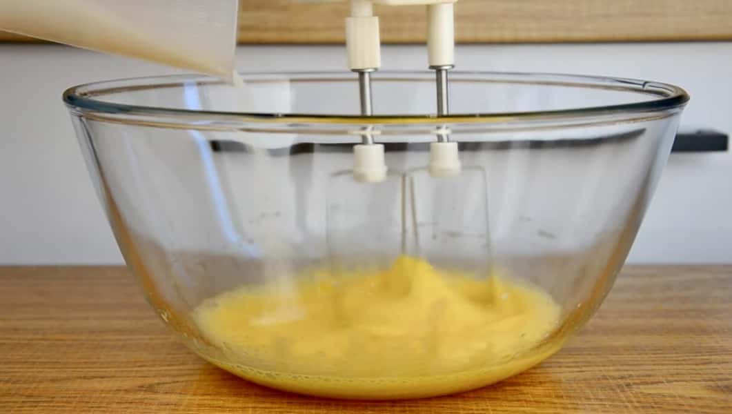 Спочатку потрібно 3 яйця збити міксером до однорідності. А потім поступово висипати до них 90 г цукру і продовжити збивати на високій швидкості.