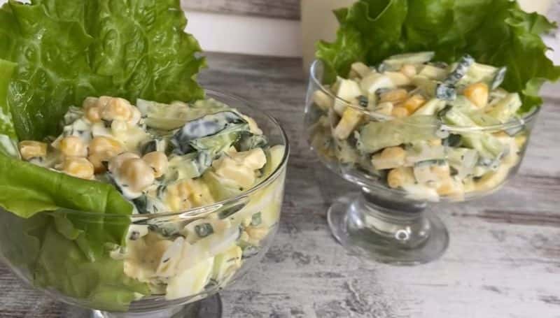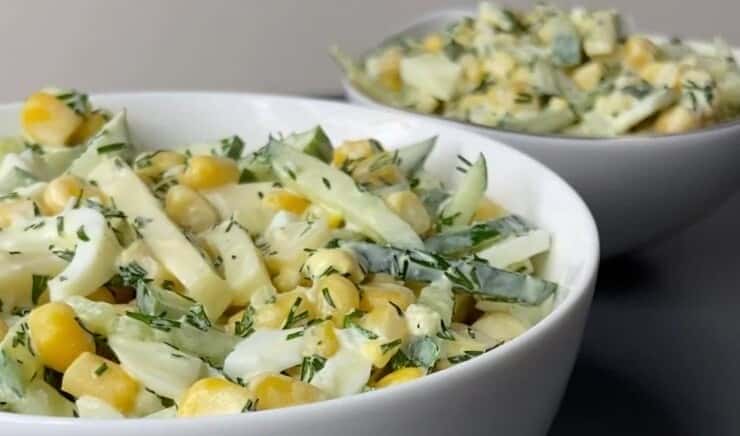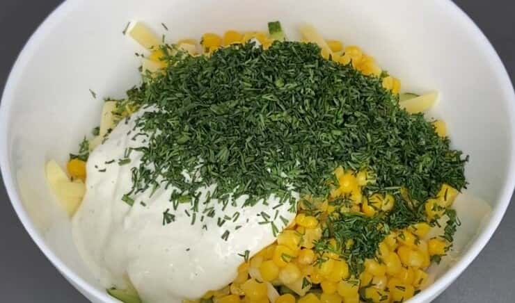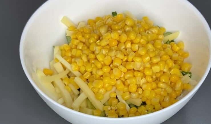 У салаті є ще й консервована кукурудза. Знадобиться одна баночка. Зливаємо з кукурудзи рідину, додаємо в салатник.