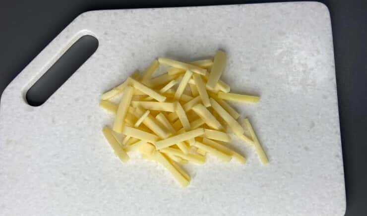 Наступний важливий продукт у цьому салаті, сир. Його ми теж нарізаємо такою ж соломкою, як і огірки.