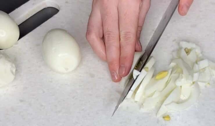 Яйця зварити круто, остудити і нарізати соломкою.