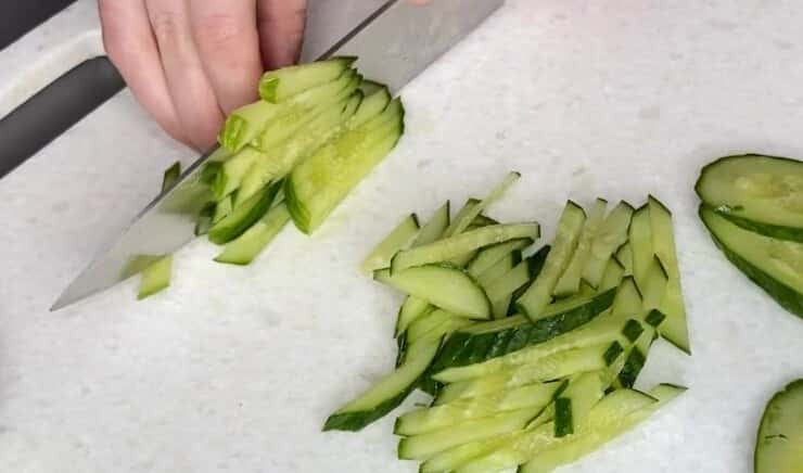 Огірки нарізаємо також соломкою. Саме вони надають салату свіжість та приголомшливий аромат.