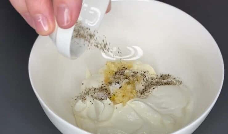 Як заправку я використовую майонез, але в оригінальному рецепті була сметана. Обов’язковий компонент у заправці – це часник. Пропускаємо через прес і змішуємо з майонезом чи сметаною. Та й чорний мелений перець, сіль за смаком.
