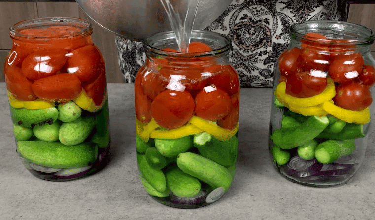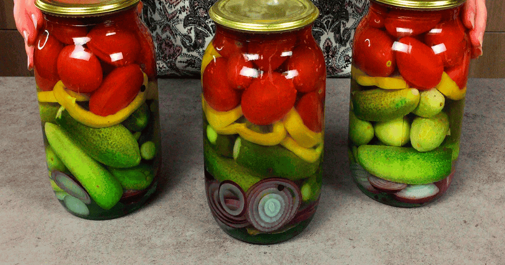 Овочі виходять дуже смачні, ароматні, а огірочки дуже хрусткими. Такі банки чудово зберігаються за кімнатної температури не один рік. Спробуйте приготувати кілька баночок на пробу, я впевнена, що Вам сподобаються!