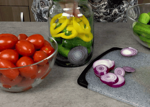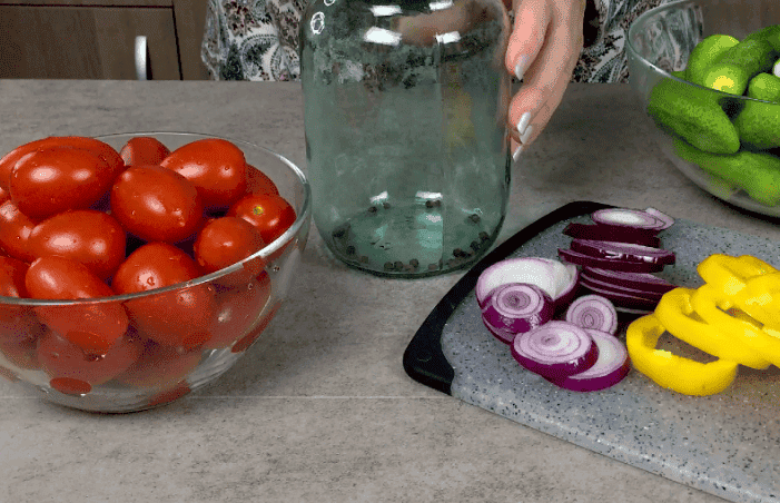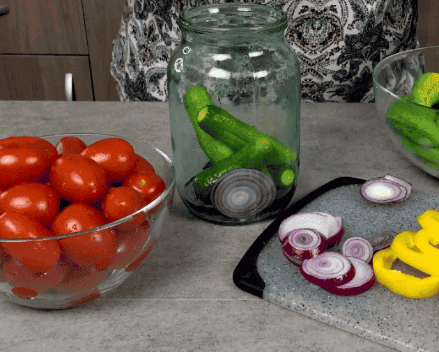 - Овочі в довільних пропорціях в мене це: огірочки, помідори, перець і цибуля