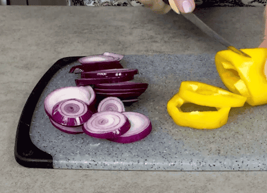 Цибулю нарізаю кільцями, можна нарізати на невеликі шматочки. Солодкий болгарський перець мию, очищаю від насіння та нарізаю кільцями.