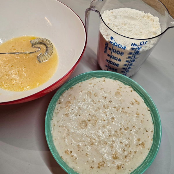 У мисці збиваємо вінчиком 2 яйця + щіпка солі + 1-2 ст. ложки цукру + опара. Добре перемішуємо і вводимо поступово 600 г борошна. Спочатку мішаємо вінчиком, потім рукою. Перед останньою добавкою борошна додаємо 3-4 ст ложки олії.