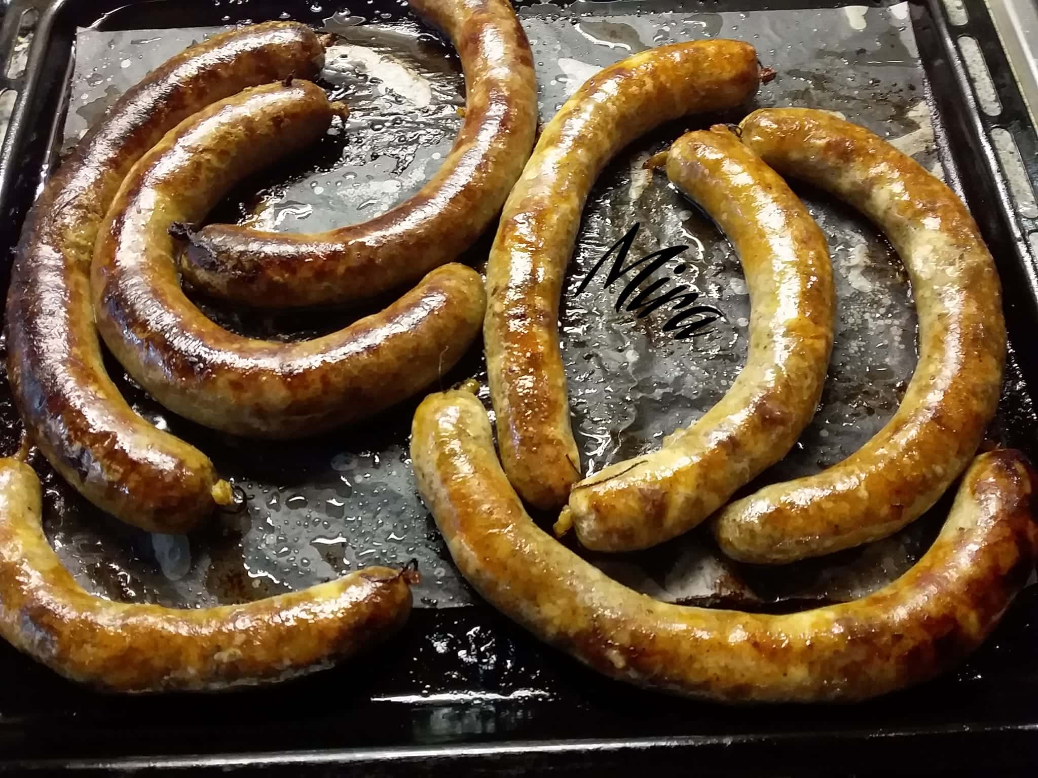 Або змастити ковбасу олією і запекти в духовці (200° 30-40 хвилин, теж з двох сторін).