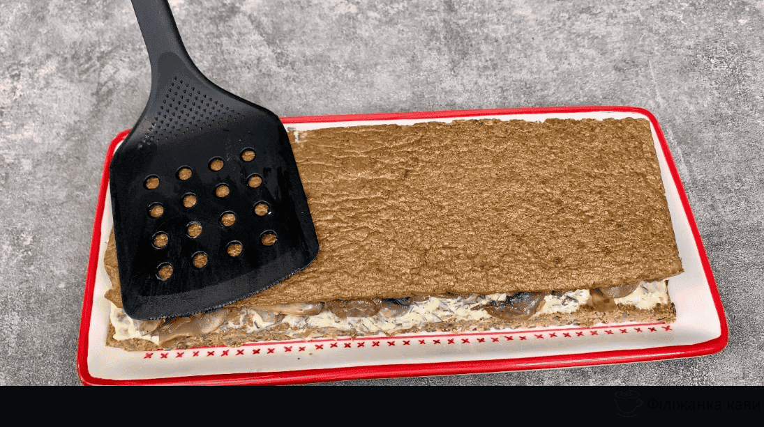 - Корж, що остигнув, нарізаємо на рівні частини (в ідеалі 3-4) і збираємо торт. Перший корж змащуємо соусом, викладаємо грибну засмажку і повторюємо так до верху.