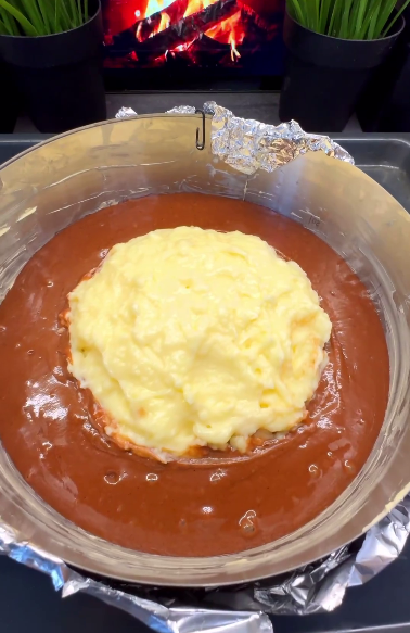 Тісто виливаємо у форму діаметром 23 см. Зверху викладаємо крем, випікаємо в заздалегідь розігрітій духовці при 180 гр. С 45 хв.