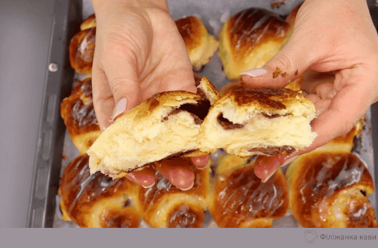 - Обережно знімаємо рушник та пакет і змащуємо булочки сумішшю жовтка та молока.