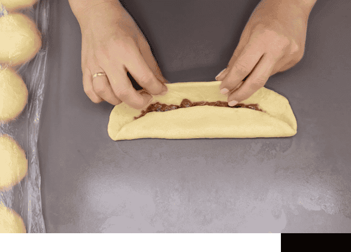 - Беремо кульку тіста, розкачуємо її в овал. Тут найголовніше тонко не розкачувати! Викладаємо на центр приблизно 2 ч. л. пудингу, рівним шаром розрівнюємо його. Накриваємо начинку спочатку однією частиною тіста, потім – іншою і добре защипуємо шов.