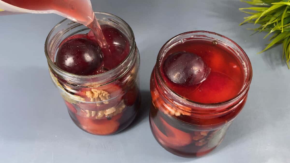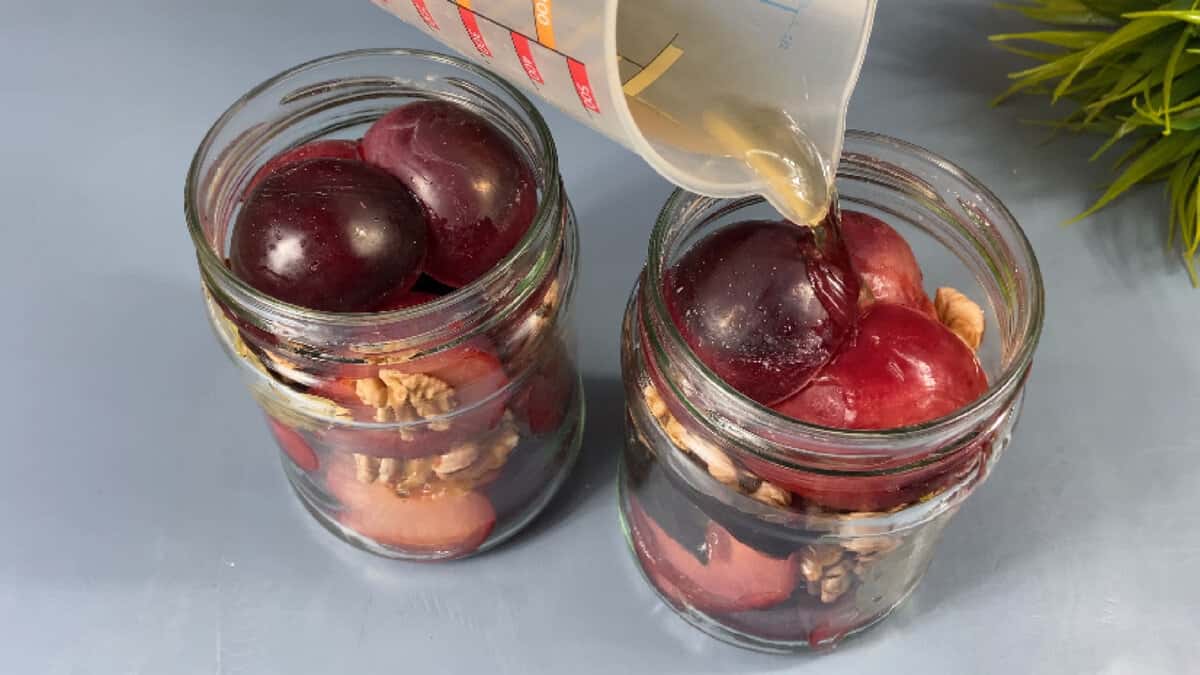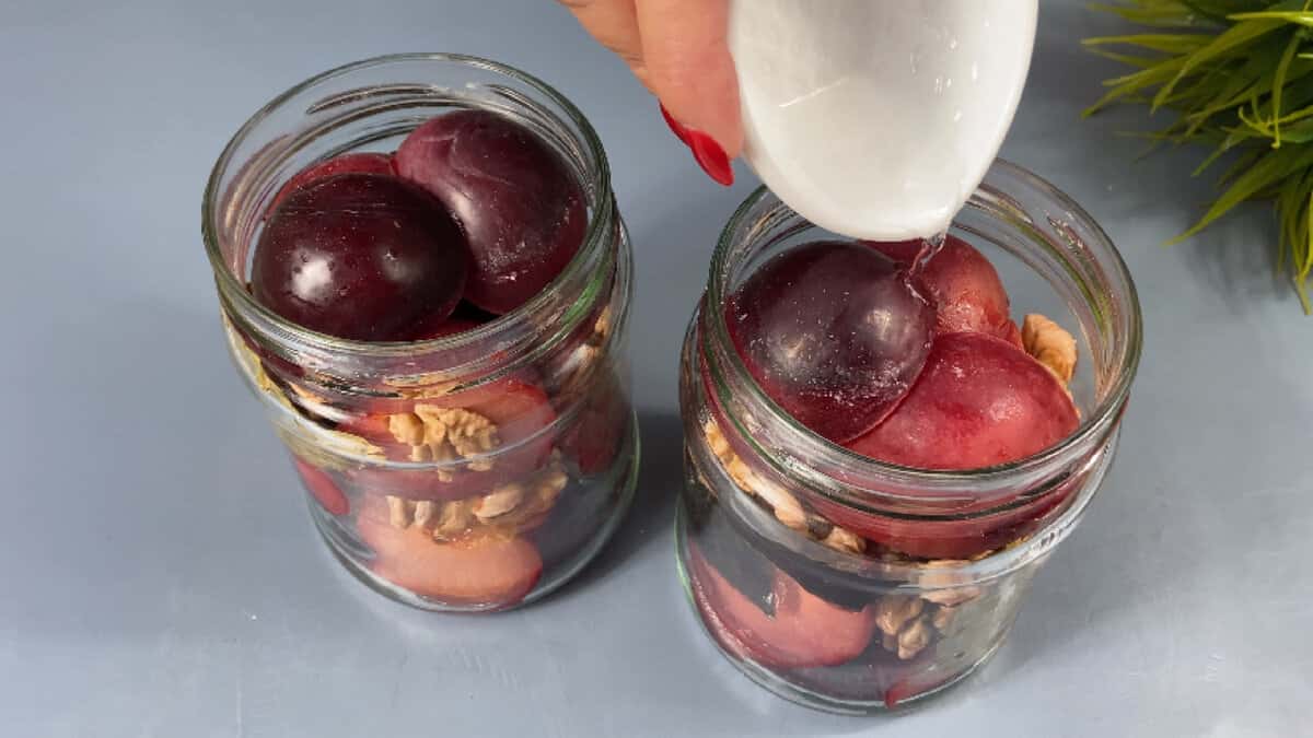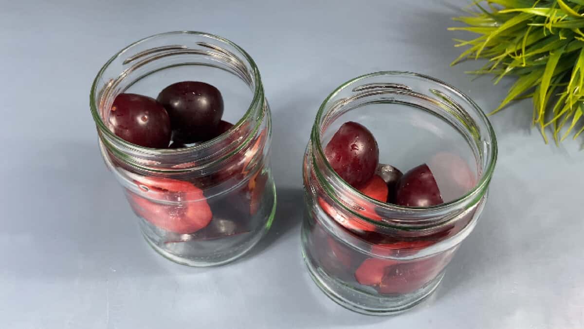 2. Беремо дві банки об’ємом 1 літр кожна і заповнюємо сливою до половини.