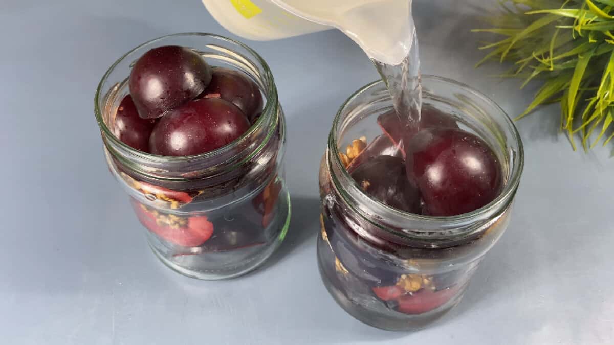 4. Докладаємо сливу до самого верху, наливаємо в банки окріп, накриваємо кришками і залишаємо на 15 хвилин, потім воду зливаємо в каструлю.