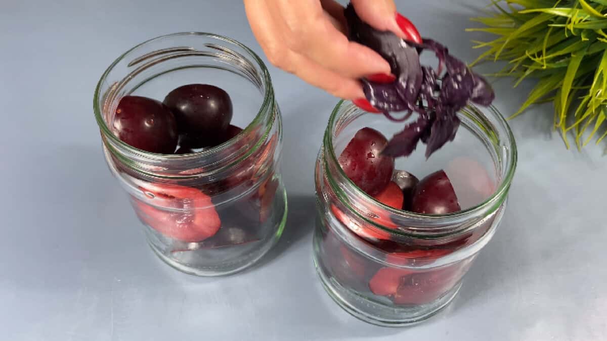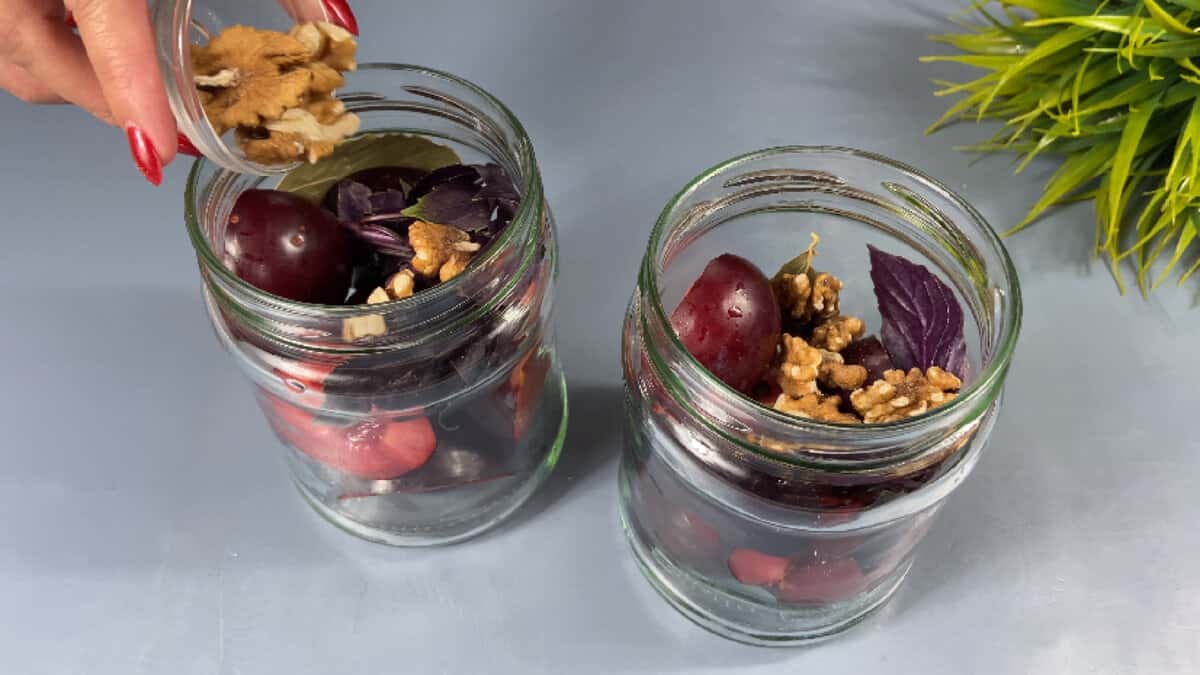 3. Потім кладемо в банки по гілочці базиліка, лавровий лист, сушену гвоздику, запашний перець і волоські горіхи.