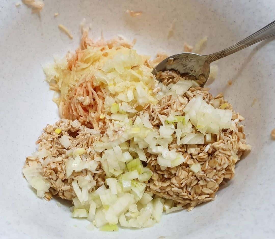 - Змішати набряклі пластівці з картоплею, цибулею та часником. Добре перемішати. Залишити ще на 15 хвилин.