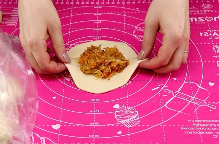 Беремо кульку тіста, злегка розгортаємо її, на центр кладемо начинку, піднімаємо 2 краї тіста вгору, з’єднуємо разом, защипуємо шов.