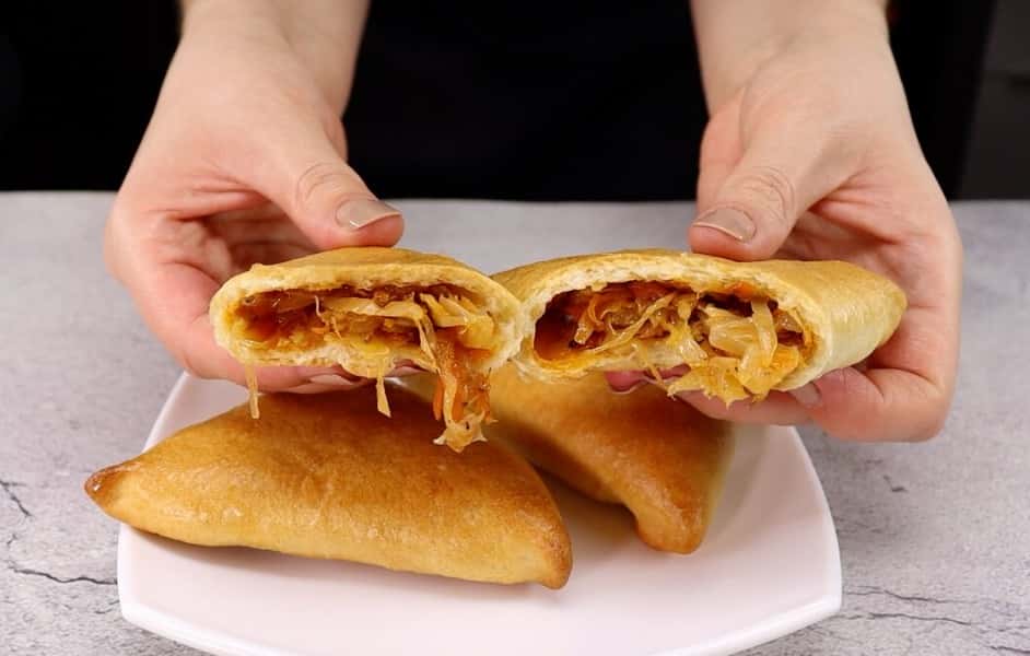 Ось тепер пиріжки готові. Вони дуже смачні, м’які, ніжні, із соковитою капустяною начинкою всередині.