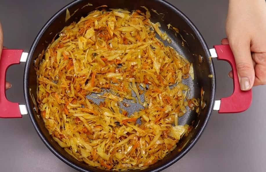 Перемішуємо овочі та тушкуємо їх до напівм’якості капусти. Тепер додаємо 1 ч. л. томатної пасти, сіль за смаком, 1 ч. л. цукру та чорний мелений перець теж за смаком. Тушкуємо овочі ще 5 хвилин, періодично помішуючи. Даємо начинці повністю охолонути.