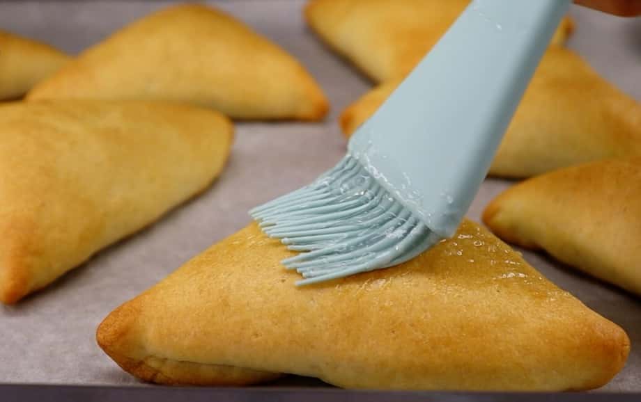 Дістаємо пиріжки з духовки та гарячі обмазуємо розведеним крохмалем. За рахунок чого випічка буде глянцевою. Повертаємо до духовки ще на 3 хвилини.