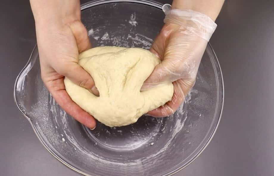 Тісто досить швидко збирається в єдину грудку, але продовжуємо вимішувати протягом 5 хвилин до гладкості та еластичності. Тісто не повинно прилипати до рук і має бути дуже м’яким.