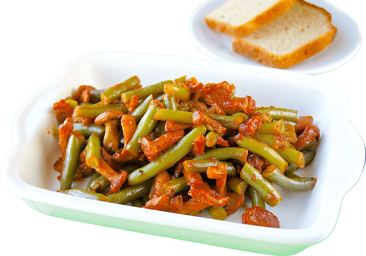 - Додайте розморожену стручкову квасолю і обсмажте. Посоліть за смаком.