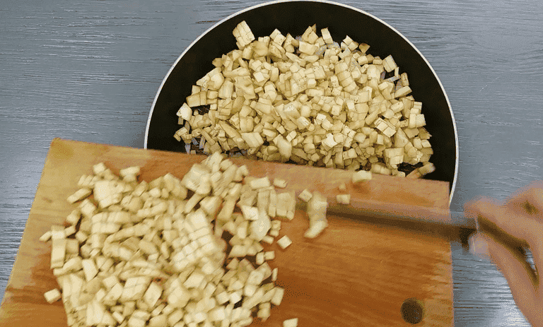 Баклажани очищаємо від шкірки і також нарізаємо дрібними кубиками.