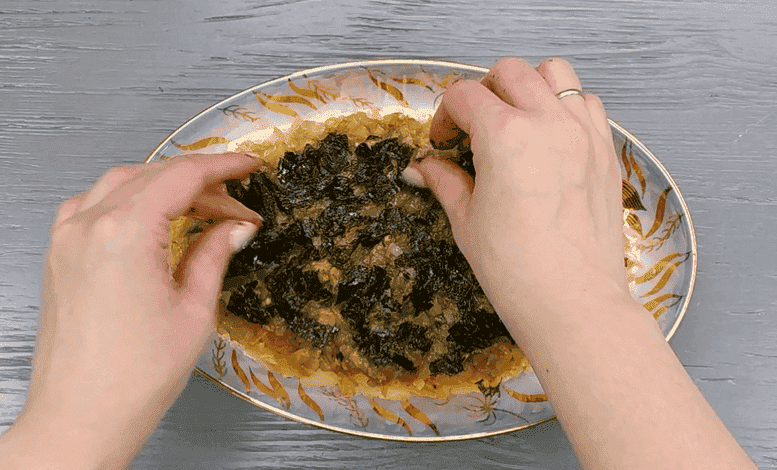 Найзручніше збирати салат у кільці, так він вийде рівним. Я збирала просто на тарілці.