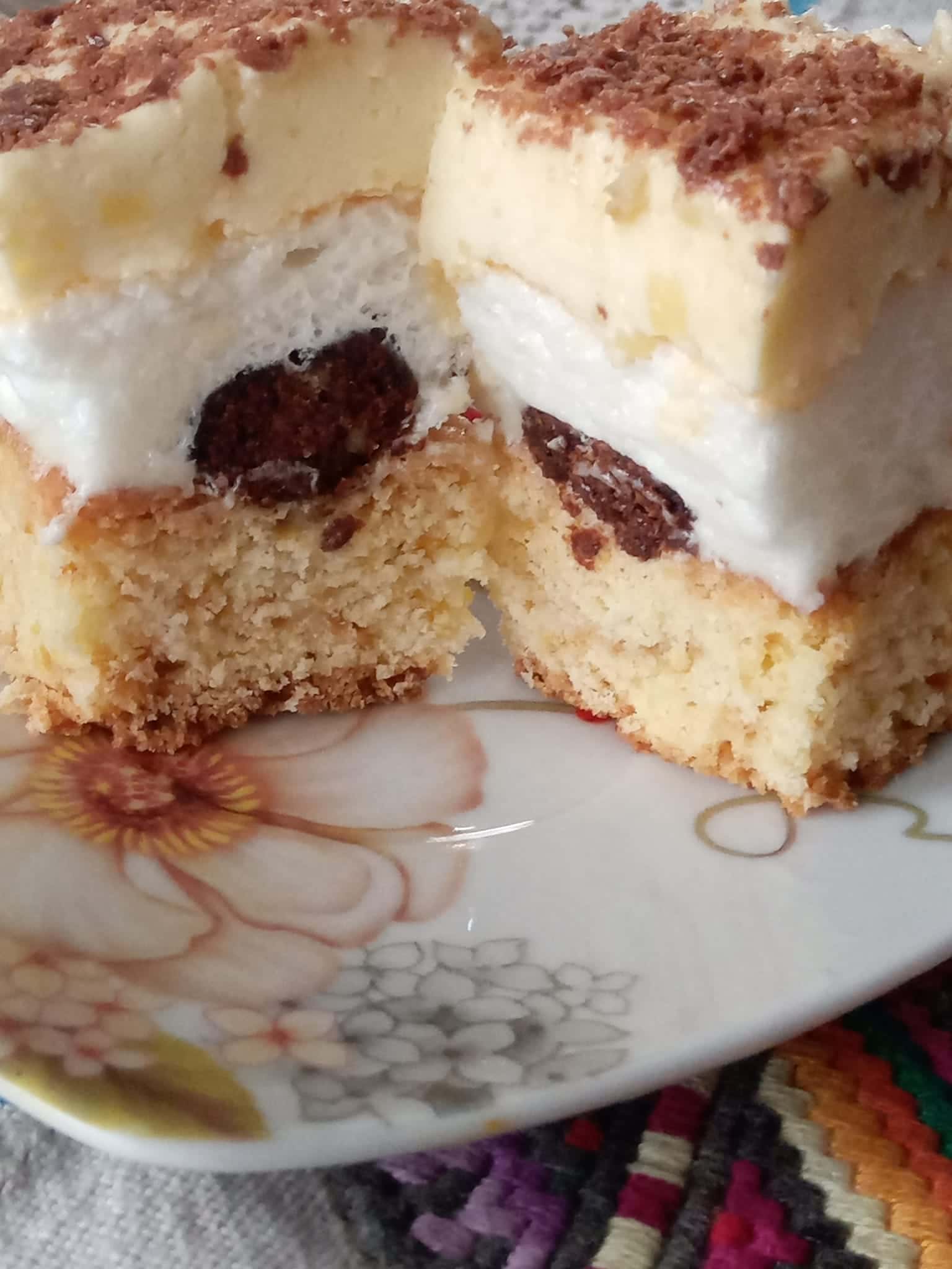 Тісто. Борошно перетерти з маргарином, додати розпушувач, цукор ванільний цукор, жовтки, сметану, замісити м’яке еластичне тісто, загорнути в харчову плівку, поставити в холодильник, на 30 хвилин.
