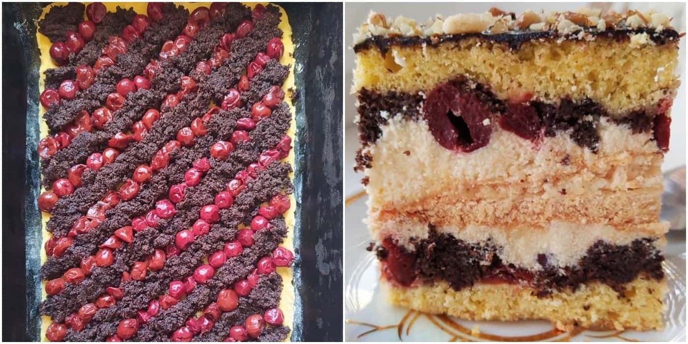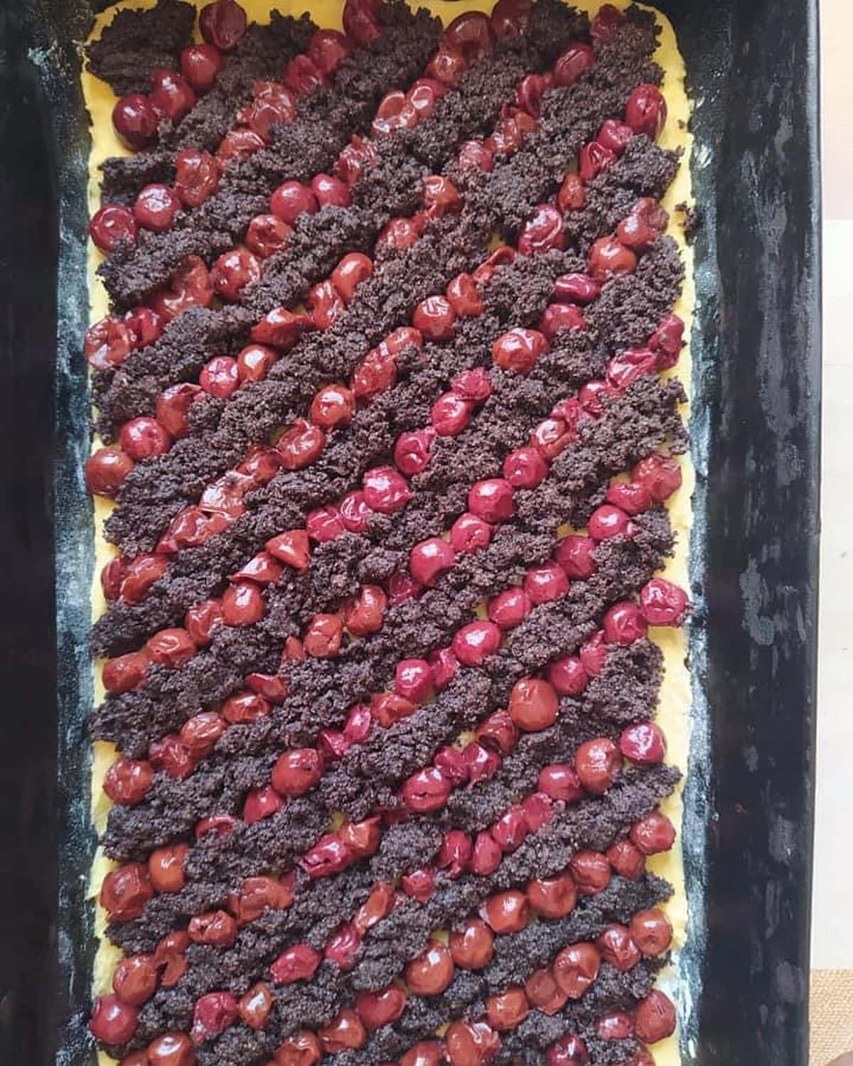 На вищезгадане тісто у бритванці викладаємо купками мак і вишні. Вишні беру орієнтовно 1 літр у власному соку, попередньо добре відціджую. На фото я показала, що викладаю смужками, так набагато швидше, а результат той самий)).
