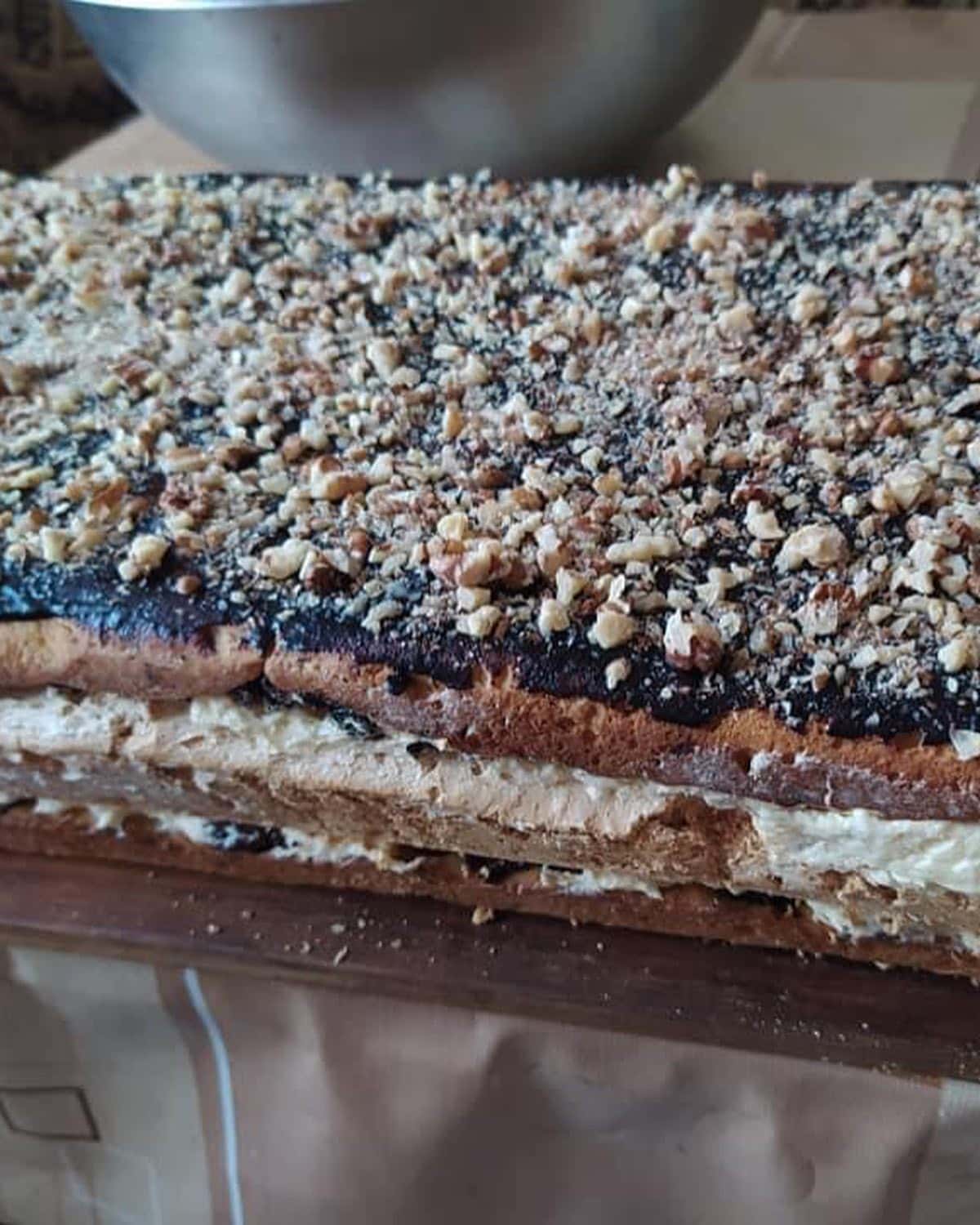 Окремо готуємо безе: 5 білків збиваємо з 2 скл цукру до штивних піків. Випікаємо у вже нагрітій від попереднього випікання духовці, але температура до 150°С, тому одразу зменшуємо газ. Я випікаю у тій же бритванці до 2 годин, але на дно кладу пергамент. Боюся не витягнути потім крихке безе))