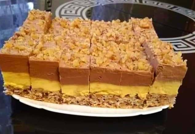 Складання. На горіховий корж наносимо спочатку жовтий крем, потім шоколадний