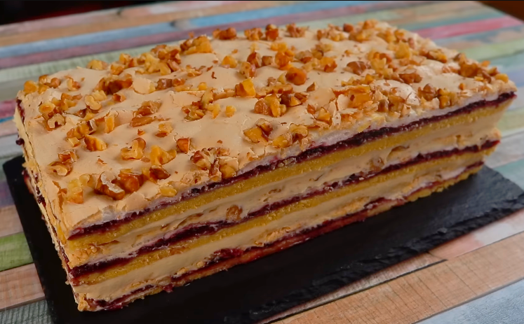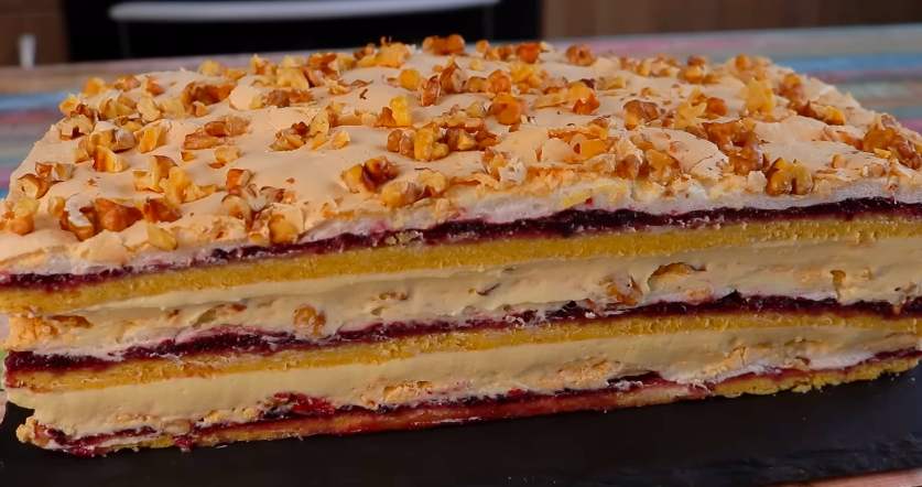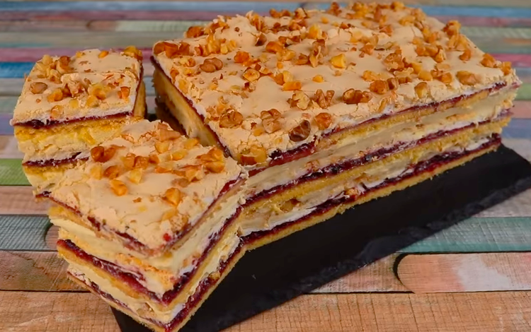 Пляцок «Пані Валевська» (польський торт) – це пісочні коржі, шар смородинового джему, безе з волоськими горіхами або мигдальною крихтою і все рясно змащене ванільним заварним кремом.