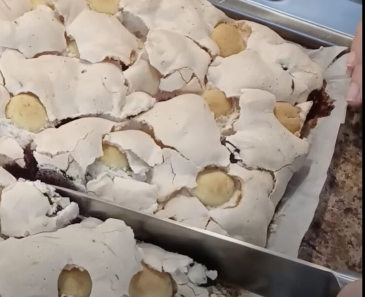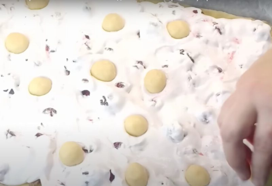 Викладаємо на кульки, горіхи та вишню білковий шар. На білки викладаємо кульки із тіста.