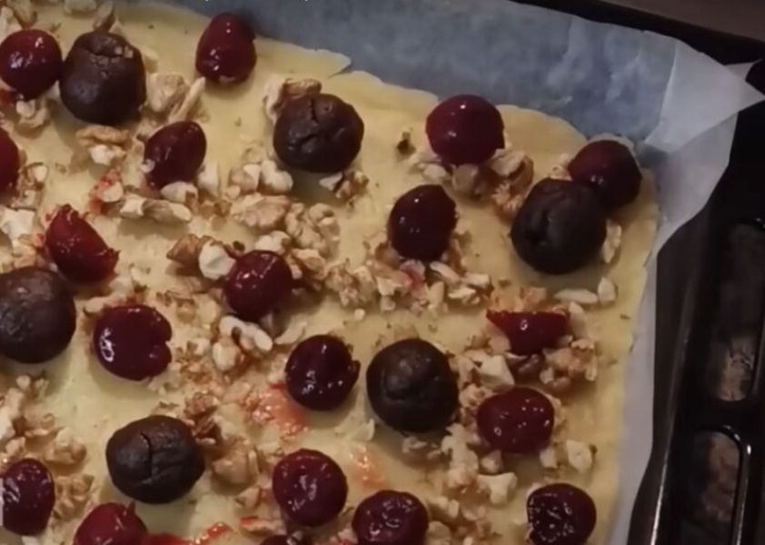 Злегка у сухій сковороді підсушуємомо горіхи, а потім подрібнюємо. Висипаємо подрібнені горіхи на тісто. Кладемо між шоколадними кульками вишню.