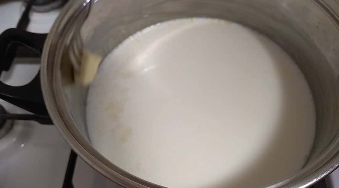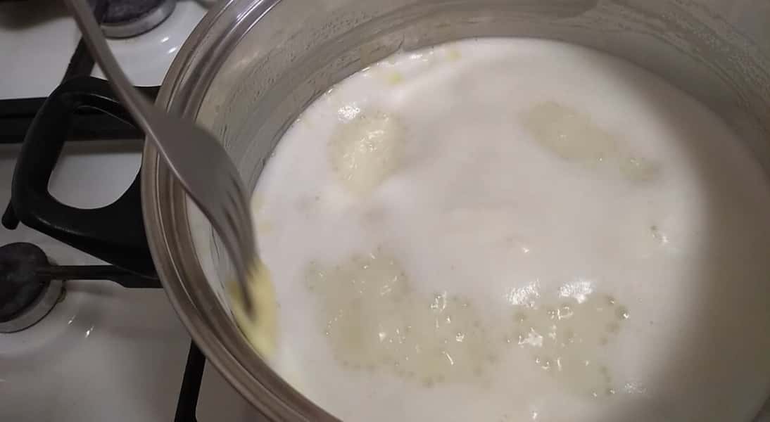 Молоко трохи прогрілося, беремо вилку, наколюємо шматочок масла ним і змащуємо краї каструлі, так молоко при закипанні не так швидко підніматиметься, і пригорятиме. Таку процедуру з маслом можна буде повторити ще раз у процесі варіння.