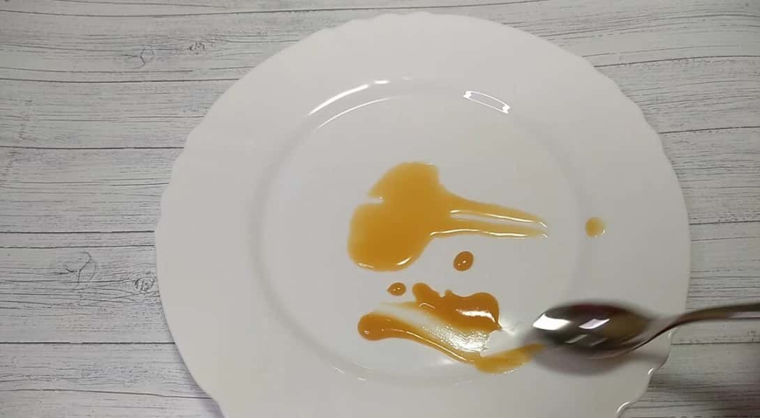Пройшло 55 хвилин , згущене молоко ще уварилося, стало густішим. В цей момент можна починати перевіряти молоко на готовність. Беремо трохи згущеного молока наливаємо на тарілку, проводимо ложкою, якщо краї згущеного молока сходяться один до одного, згущене молоко ще треба проварити 7-10 хвилин.