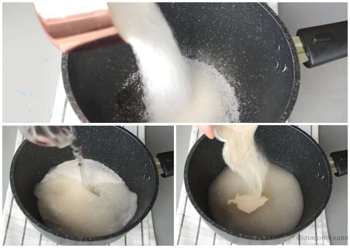 Варимо сироп. Для цього в сотейнику змішаю воду, цукор і агар-агар. І ставлю на вогонь, при постійному помішуванні варю до стану тонкої нитки. Агар-агар в цьому рецепті не можна змінити на желатин, використовую агар силою 900. Дуже важливо, якщо ви берете його не в кондитерському магазині, а в звичайному продуктовому, дивитися на склад. У складі повинен бути тільки агар.