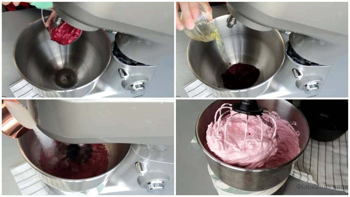 Якщо готуєте на стаціонарному міксері, то сироп і збивання пюре можна поєднати. Якщо готуєте ручним, то спочатку збиваємо білок, а потім варимо сироп.