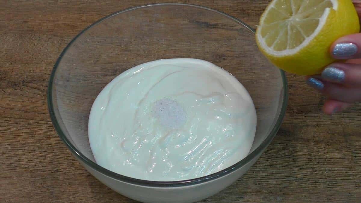 Сюди ж викладаємо 260 грам класичного натурального йогурту, додаємо пів чайної ложки солі і половину чайної ложки лимонного соку. Гарненько все перемішуємо лопаткою.
