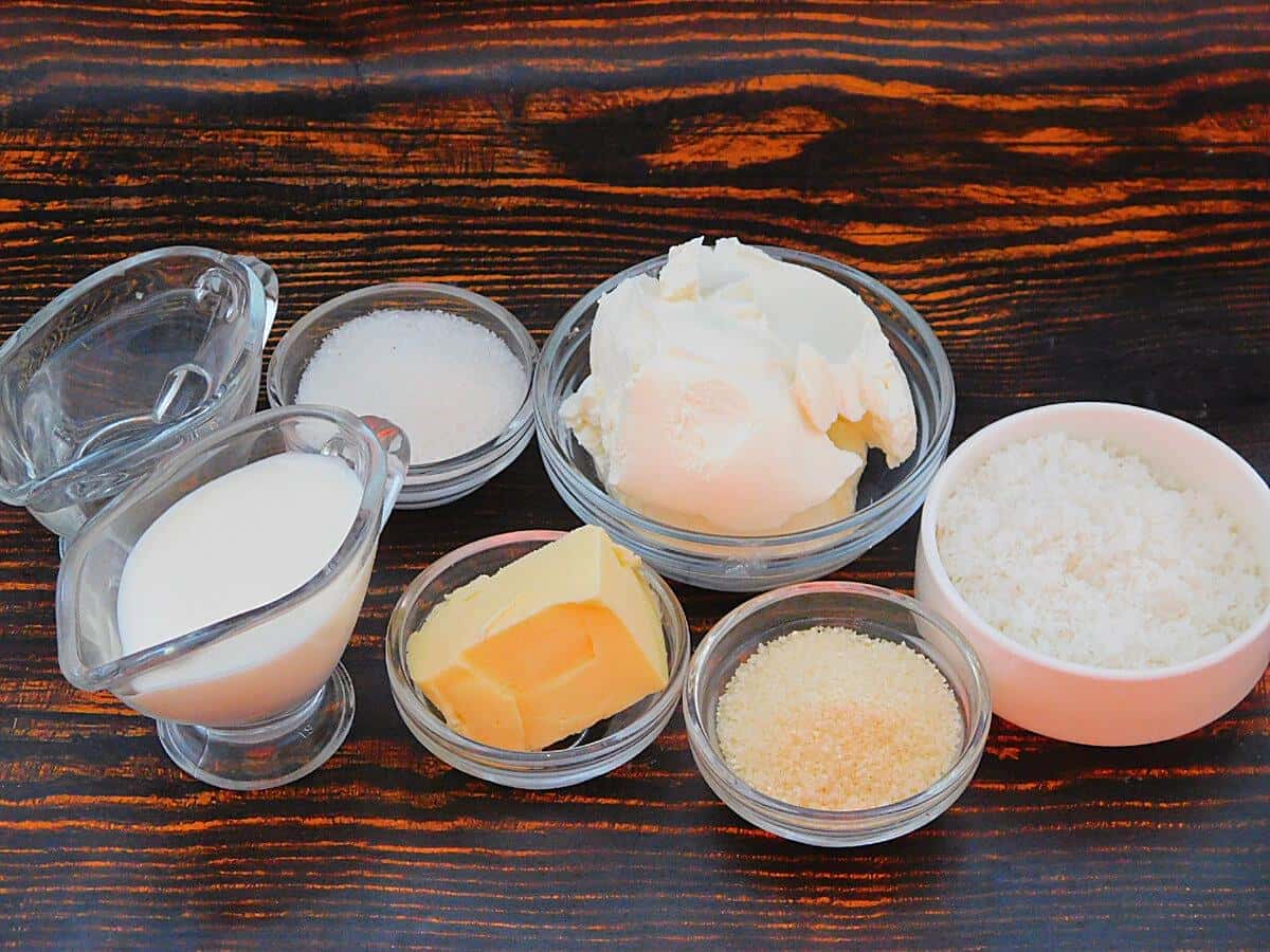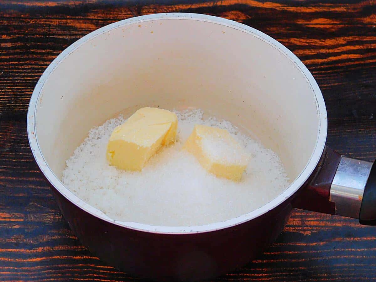 Для основи в сотейник або сковорідку висипати кокосову стружку і цукор, викласти вершкове масло.