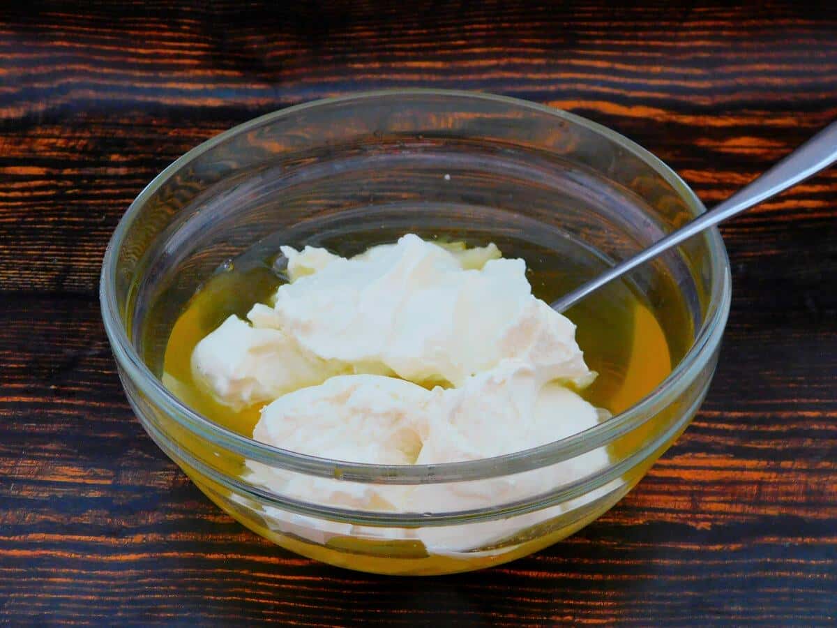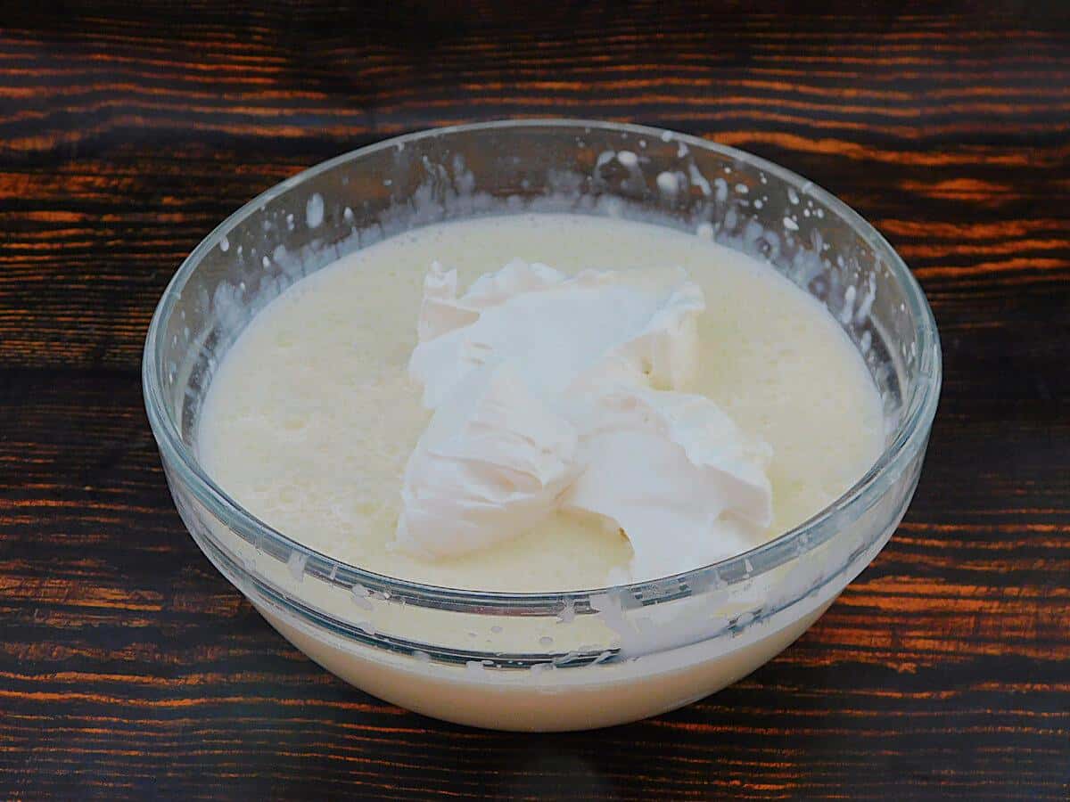 Збити міксером до об’єднання компонентів. Вершки збити окремо до піків і в кілька прийомів ввести в основну суміш, користуючись міксером на малих обертах.