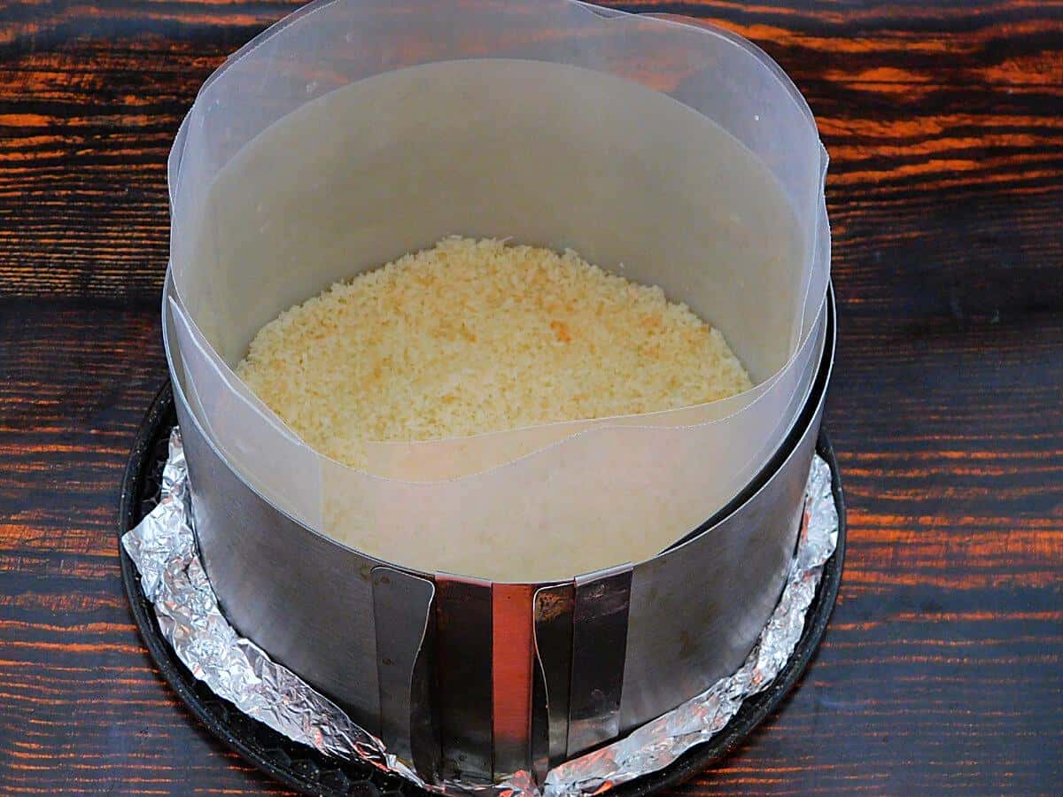 Викласти половину в роз’ємну форму, тут діаметр 17 сантиметрів. Розрівняти, ущільнити руками і відправити в холодильник.