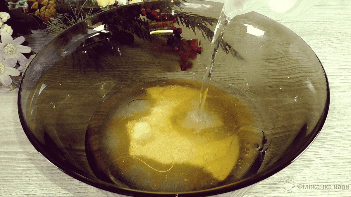 Тепер додаємо гарячу воду, добре перемішуємо до повного розчинення цукру і з’єднання всіх інгредієнтів.