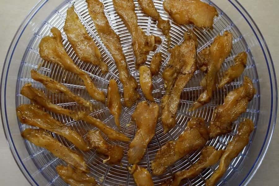 6. Після закінчення часу маринування розкласти курячі шматочки на піддони сушки. Бажано розкласти курячі смужки так, щоб вони між собою не стикалися, щоб коли настане час знімати м’ясо, воно було саме шматочками, а не пластом. Сушити м’ясо за температури 70 градусів 4-5 годин. Під час сушіння бажано кожні 2-3 години міняти піддони місцями для більш рівномірної готовності.