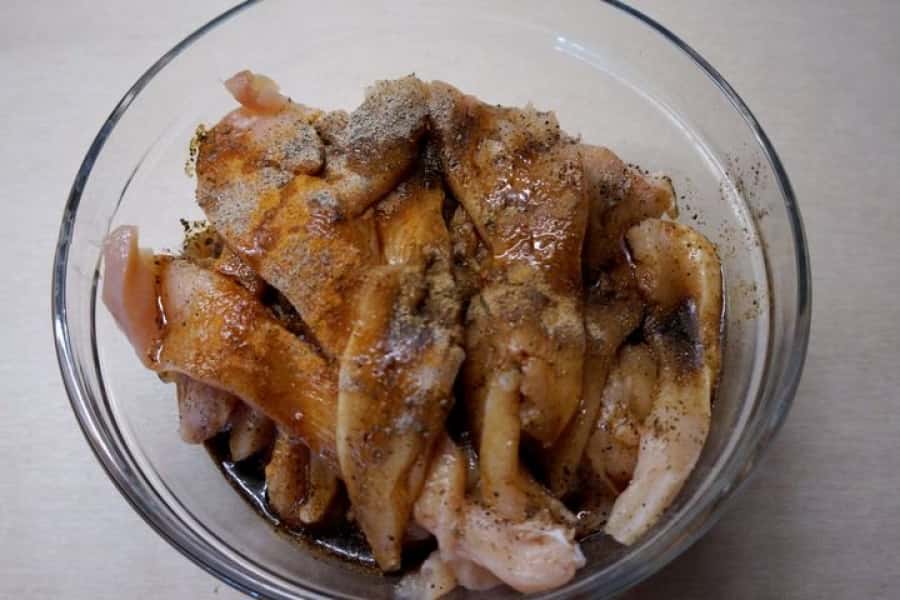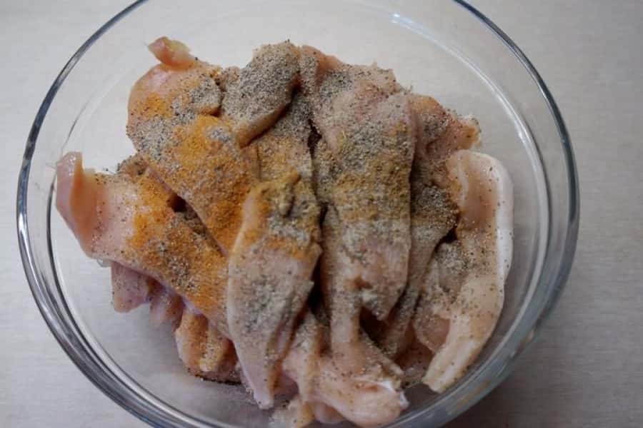 3. Викласти нарізану курячу грудку в ємність і додати спеції до смаку.
