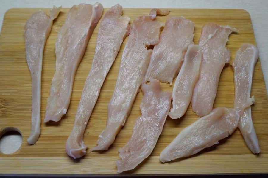 2. Нарізати курячу грудку на тонкі смужки приблизно 0,5 мм. Щоб легше різати курячу грудку на тонкі шматочки, попередньо м’ясо треба покласти в морозилку на 1-2 години. Чим тонше вийдуть смужки, тим швидше грудка приготується.