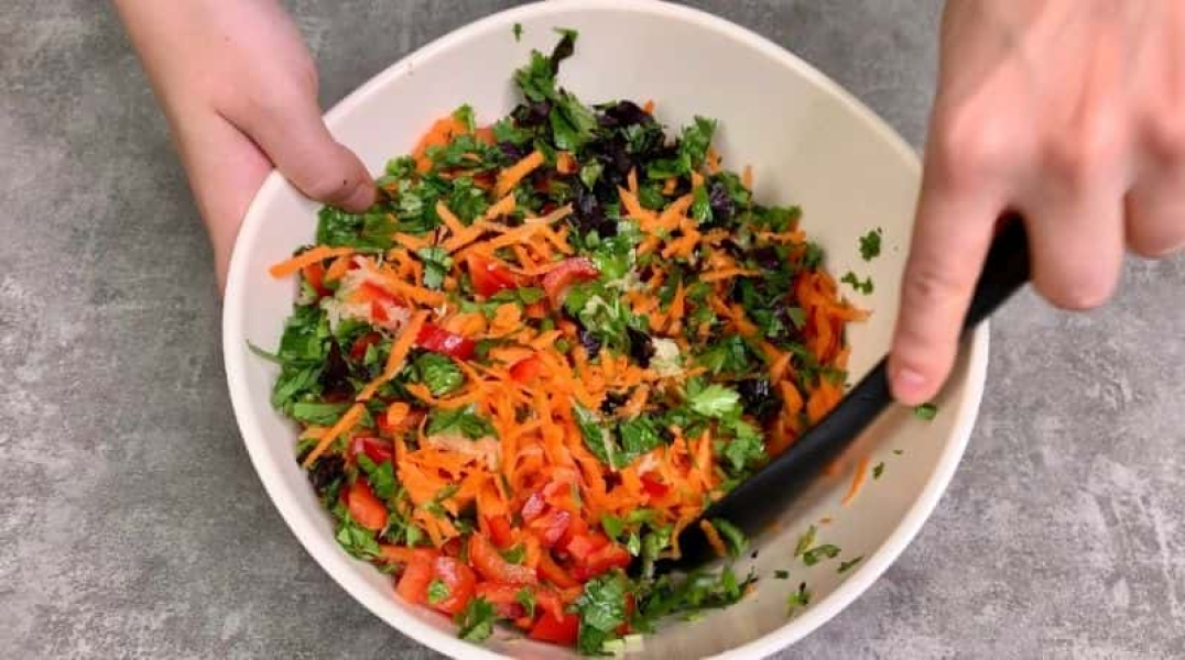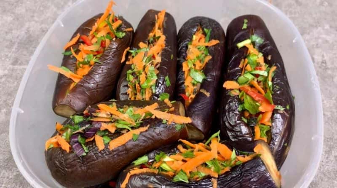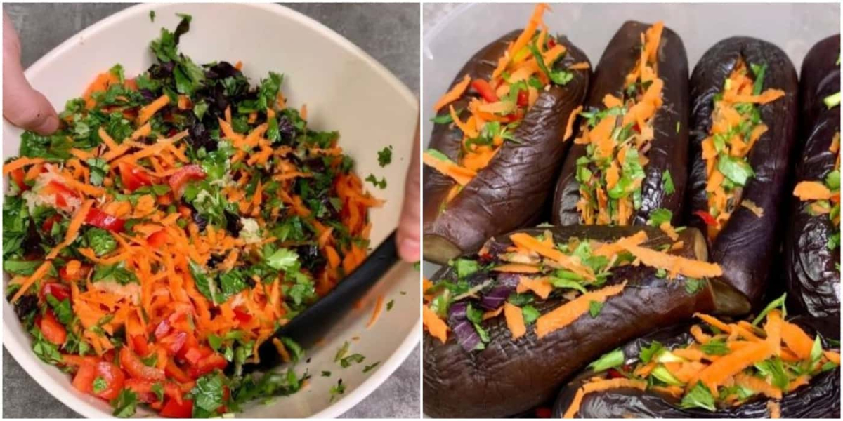 Далі готуємо начинку. Для цього з’єднуємо терту моркву, болгарський перець соломою, дрібно нарізаний гострий перець, тертий часник, зелень петрушки, селери, базиліка та кінзи (за смаком можна щось прибрати, якщо не подобається). Набиваємо охолоджені баклажанні човники салатом і щільно один до одного укладаємо у відповідний за розміром контейнер.