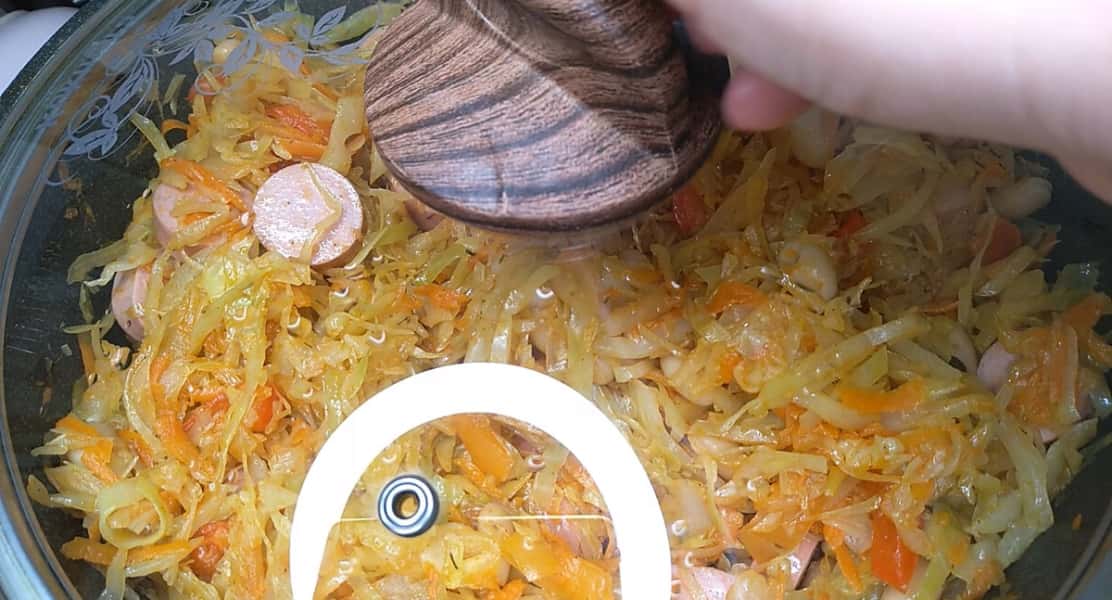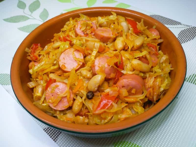 Капуста протушилася, перчимо, додаємо лавровий лист, перець горошком, нарізані сосиски, консервовану або відварену квасолю, добре перемішуємо і тушимо під кришкою 10-15 хвилин, до готовності.